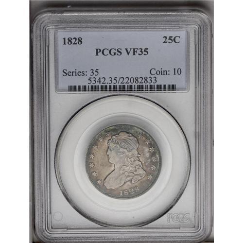 <B>1828<25C> VF35 PCGS.</B></I> B-1, R.1. Waves of golden-brown and sea-green emerge when the piece is rotated beneath a light. A glossy and smooth Bust quarter that has a thin granular streak west of the date.