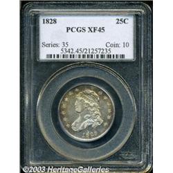 1828 25C XF45 PCGS. B-1, R.2. The cap, cheek, and drapery have light rub, but considerable luster glimmers within the hair tresses and eagle's plumage. The golden-brown and sea-green patina is both original and attractive. The first 8 in the date has a thin planchet streak, as made. Important notice: Heritage usually auctions material at the rate of 200-250 lots per hour. On some occasions eBay Live bid software or the Internet may not be able to keep up with the pace of the auction. We recommend placing a realistic absentee bid now as insurance to avoid disappointment. Occasionally the auctioneer may eliminate or reject an eBay Live bid, and the auctioneer may also reopen a lot after the close of the eBay live bidding (usually because we missed an audience bid), and may reject your bid even if it shows you as the winning bidder. By bidding via eBay Live, you agree that Heritage may award the lot to another bidder at its sole discretion under the circumstances described above or any other reasonable circumstances. Also please note that all Heritage lots purchased through eBay Live carry a 20% Buyer's Premium. Please make sure you read the Terms and Conditions before you bid.