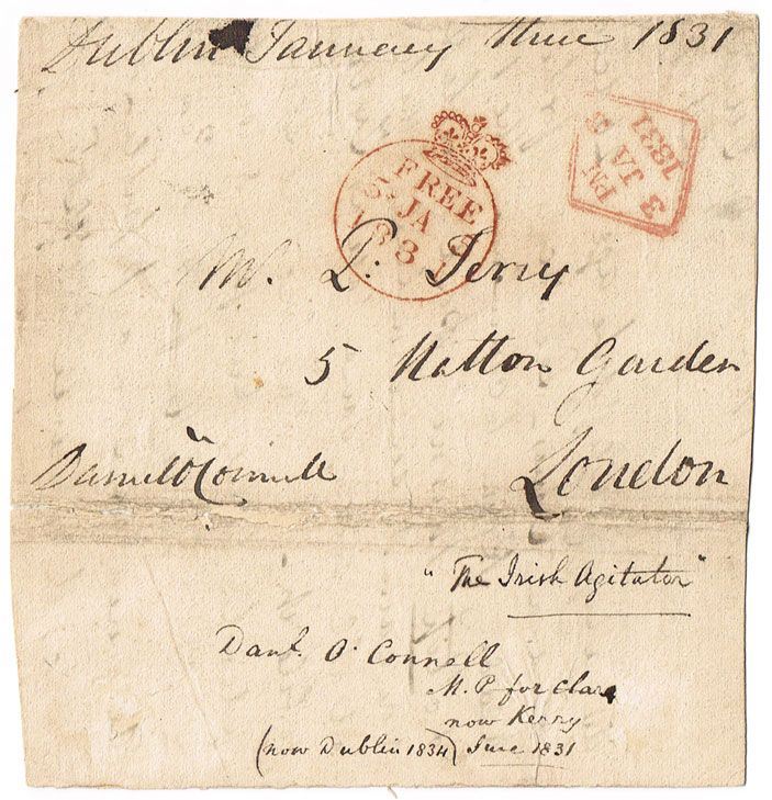 Envelope sent to Marlborough Street Dublin by Daniel O'Connell from Caherciveen with signature lower left, free post mark and seal of O'Connell in red wax to reverse. Also with another envelope sent to London in 1831 again with signature lower left and contemporaneous inscription on reverse describing O'Connell as "The Irish Agitator" (2 items)