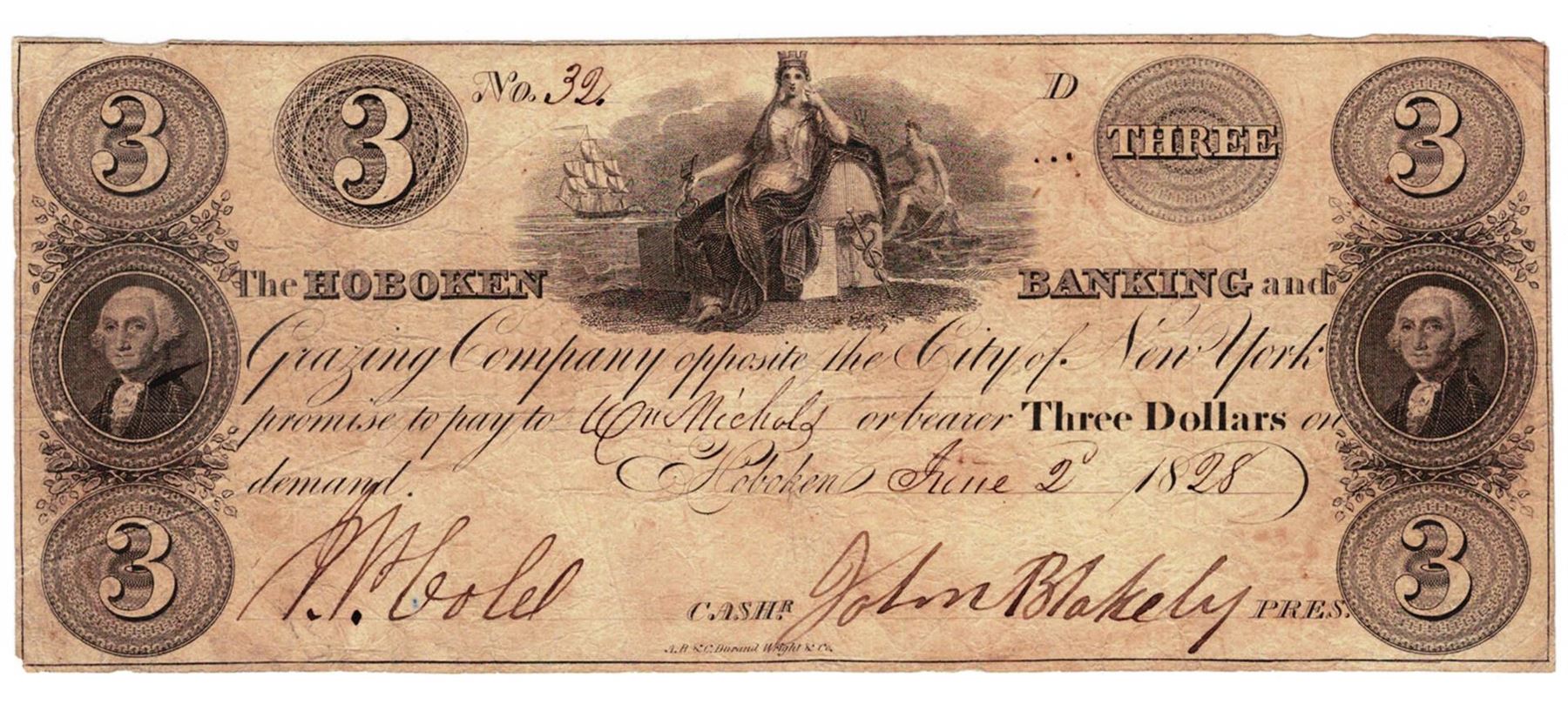 1828 $3 Hoboken Banking, NY Obsolete Bank Note