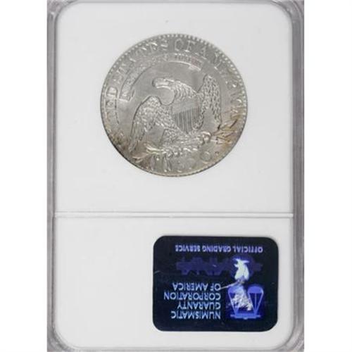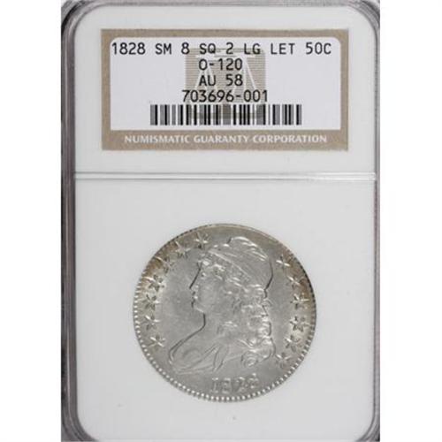 <B>1828 50C Square Base 2, Small 8, Large Letters AU58 NGC.</B></I> O-120, R.1. The cartwheel luster is nearly complete, and the surfaces are smooth despite a thin mark near the N in UNITED. The borders display glimpses of tan-gold toning.<BR><BR><B>Coin Engraver:</B> John Reich<BR><BR><b>Shipping:</b> Coins & Currency (<a target="_blank" href="http://www.heritageauctions.com/common/shipping.php">view shipping information</a>)