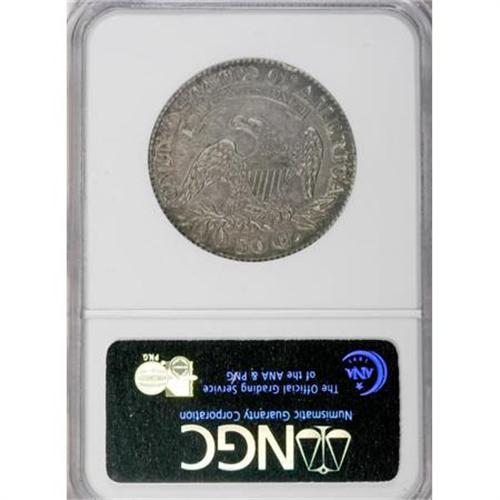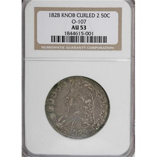 <B>1828 50C Curl Base 2, Knob AU53 NGC.</B></I> O-107. NGC Census: (60/564). PCGS Population (32/324). Mintage: 3,075,200. Numismedia Wsl. Price for NGC/PCGS coin in AU53: $400. (#6149)<BR><BR><B>Coin Engraver:</B> John Reich<BR><BR><b>Shipping:</b> Coins & Currency (<a target="_blank" href="http://www.heritageauctions.com/common/shipping.php">view shipping information</a>)