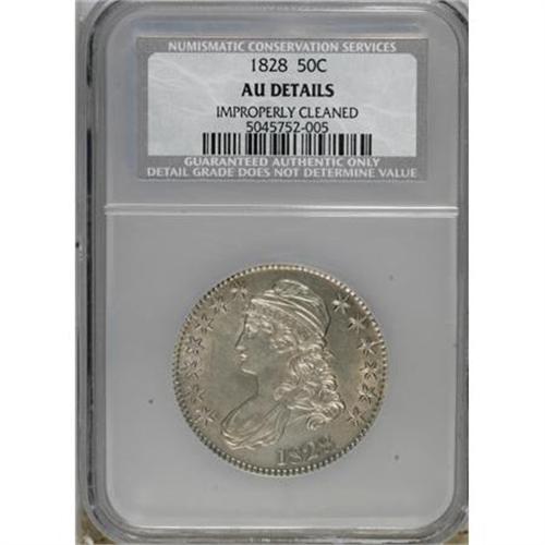 <B>1828 50C Curl Base 2, No Knob--Improperly Cleaned--NCS. AU Details.</B></I> NGC Census: (55/630). PCGS Population (49/357). Mintage: 3,075,200. Numismedia Wsl. Price for NGC/PCGS coin in AU50: $335. (#6148)<BR><BR><B>Coin Engraver:</B> John Reich<BR><BR><b>Shipping:</b> Coins & Currency (<a target="_blank" href="http://www.heritageauctions.com/common/shipping.php">view shipping information</a>)