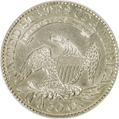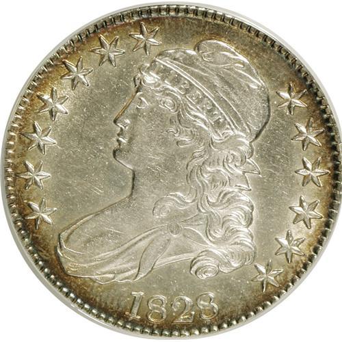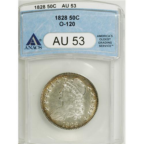 <B>1828 50C Curl Base 2, No Knob AU53 ANACS.</B></I> O-120. NGC Census: (57/553). PCGS Population (30/311). Mintage: 3,075,200. Numismedia Wsl. Price: $233. (#6148)<BR><BR><b>Shipping:</b> Coins & Currency (<a target="_blank" href="http://www.heritageauctions.com/common/shipping.php">view shipping information</a>)
