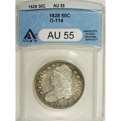<B>1828 50C Curl Base 2, No Knob AU55 ANACS.</B></I> O-114. NGC Census: (93/461). PCGS Population (82/229). Mintage: 3,075,200. Numismedia Wsl. Price for NGC/PCGS coin in AU55: $300. (#6148)<BR><BR><b>Shipping:</b> Coins & Currency (<a target="_blank" href="http://www.heritageauctions.com/common/shipping.php">view shipping information</a>)