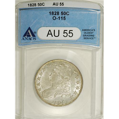 <B>1828 50C Curl Base 2, No Knob AU55 ANACS.</B></I> O-115. NGC Census: (186/922). PCGS Population (82/229). Mintage: 3,075,200. Numismedia Wsl. Price for NGC/PCGS coin in AU55: $300. (#6148)<BR><BR><b>Shipping:</b> Coins & Currency (<a target="_blank" href="http://www.heritageauctions.com/common/shipping.php">view shipping information</a>)