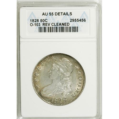 <B>1828 50C Curl Base 2, No Knob--Reverse Cleaned--ANACS. AU55 Details.</B></I> O-103. NGC Census: (92/460). PCGS Population (82/229). Mintage: 3,075,200. Numismedia Wsl. Price: $275. (#6148)<BR><BR><b>Shipping:</b> Coins & Currency (<a target="_blank" href="http://www.heritageauctions.com/common/shipping.php">view shipping information</a>)