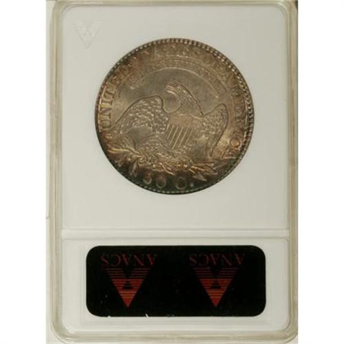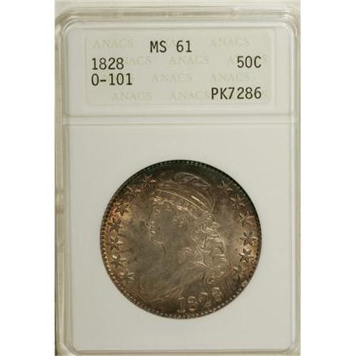 <B>1828 50C Curl Base 2, No Knob MS61 ANACS.</B></I> O-101, R.1. A small tine protrudes from the left side of Liberty's drapery, and on the reverse, the upper region of the F in OF is filled. This well struck and luminous piece has bands of golden-brown, orange, violet, and teal patina at the margins and silver-gray color at the centers. Light to moderate abrasions and a spot of deep patina affect the cheek.<BR><I>From The Vanek Collection.</B></I><BR><BR><b>Shipping:</b> Coins & Currency (<a target="_blank" href="http://www.heritageauctions.com/common/shipping.php">view shipping information</a>)