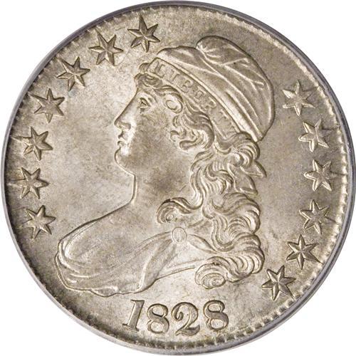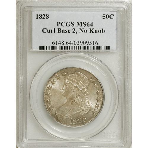 <B>1828 50C Curl Base 2, No Knob MS64 PCGS.</B></I> O-102, R.2. The well struck devices are fully lustrous, as are the open fields. The medium cream-gray toning is attractive, and thorough evaluation cannot locate any marks. Minor carbon on the upper right obverse field is hardly worthy of mention. Population: 29 in 64, 6 finer (3/07).<BR><BR><b>Shipping:</b> Coins & Currency (<a target="_blank" href="http://www.heritageauctions.com/common/shipping.php">view shipping information</a>)
