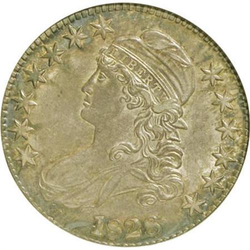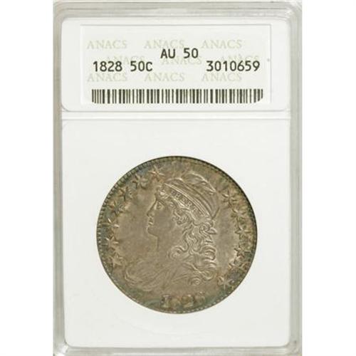 <B>1828 50C Small 8, Square 2, Large Letters AU50 ANACS.</B></I> NGC Census: 0 in 50, 0 finer (10/07).PCGS Population: 17 in 50, 147 finer (10/07).Mintage: 3,075,200. . (#6151)<BR><BR><B>Coin Engraver:</B> John Reich<BR><BR><b>Shipping:</b> Coins & Currency (<a target="_blank" href="http://www.heritageauctions.com/common/shipping.php">view shipping information</a>)