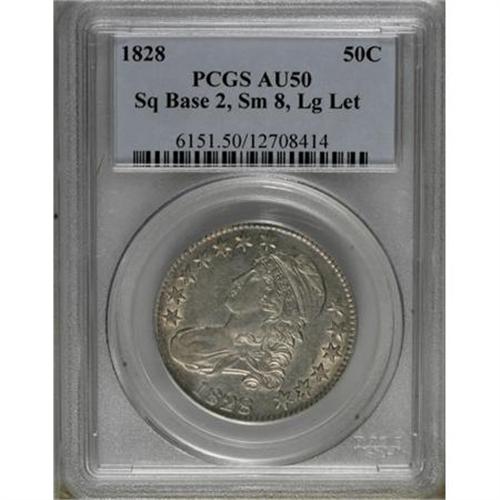 <B>1828 50C Square Base 2, Small 8, Large Letters AU50 PCGS.</B></I> PCGS Population (19/157). NGC Census: (0/0). (#6151)<BR><BR><B>Coin Engraver:</B> John Reich<BR><BR><b>Shipping:</b> Coins & Currency (<a target="_blank" href="http://www.heritageauctions.com/common/shipping.php">view shipping information</a>)