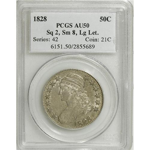 <B>1828 50C Square Base 2, Small 8, Large Letters AU50 PCGS.</B></I> PCGS Population (13/129). NGC Census: (0/0). (#6151)<BR><BR><b>Shipping:</b> Coins & Currency (<a target="_blank" href="http://www.heritageauctions.com/common/shipping.php">view shipping information</a>)
