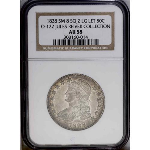 <B>1828<50C> Square Base 2, Small 8, Large Letters AU58 NGC.</B></I> O-122, R.3. An original example with pewter-gray, gold, blue, and russet toning. Still very lustrous throughout, with minimally abraded surfaces and outstanding eye appeal.<BR><I>Ex: Emil Rochet (1/5/1985).</B></I> Envelope Included.