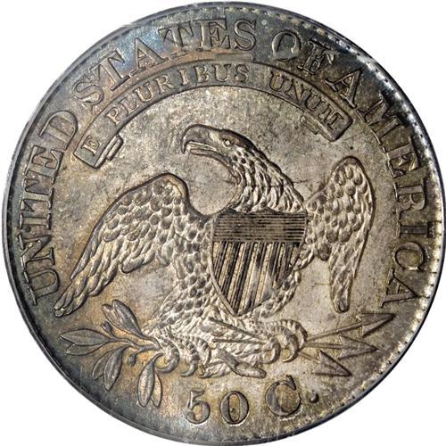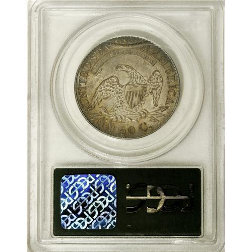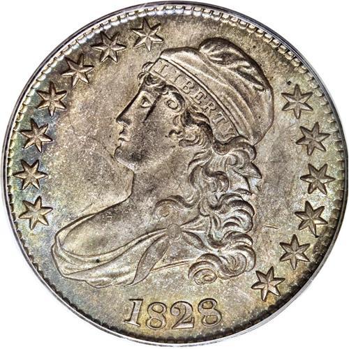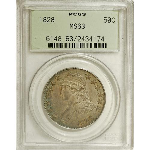 <B>1828 50C Square Base 2, Small 8, Large Letters MS63 PCGS.</B></I> O-117, R.1. The serif of C in the denomination is recut, a concise feature unique to this reverse die. This example is an early die state with no evidence of the usual reverse crack through the tops of UNITED STATES. Although it is slightly weak on the high points, this is an attractive piece with frosty gray luster and pleasing sea-green toning along the left obverse border and elsewhere. While several Mint State examples of this die marriage exist, the present specimen provides excellent eye appeal with naturally toned surfaces.<BR><I>From The Westmoreland, Virginia Collection, Part Two.</B></I><BR><BR><b>Shipping:</b> Coin/Currency (<a target="_blank" href="http://www.heritageauctions.com/common/shipping.php">view shipping information</a>)