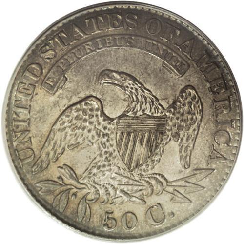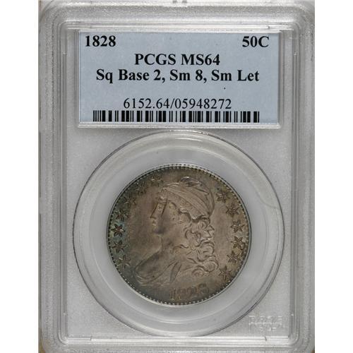 <B>1828 50C Square Base 2, Small 8, Large Letters MS64 PCGS.</B></I> O-117, R.1. Incorrectly certified as a "Small Letters" variety by PCGS. Jade-green and dove-gray embrace this gently shimmering and unmarked Bust half. The bold, even strike and smooth surfaces ensure the eye appeal. The C in 50 C is recut on this more available 1828 marriage. Population: 3 in 64, 0 finer (2/07).<BR><BR><b>Shipping:</b> Coins & Currency (<a target="_blank" href="http://www.heritageauctions.com/common/shipping.php">view shipping information</a>)