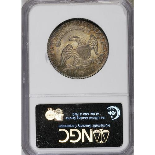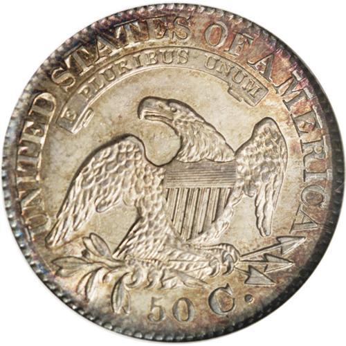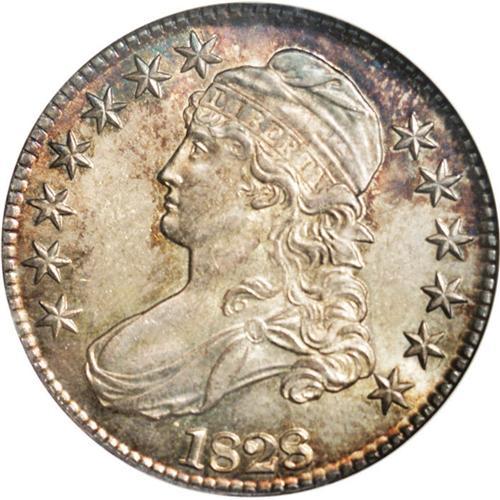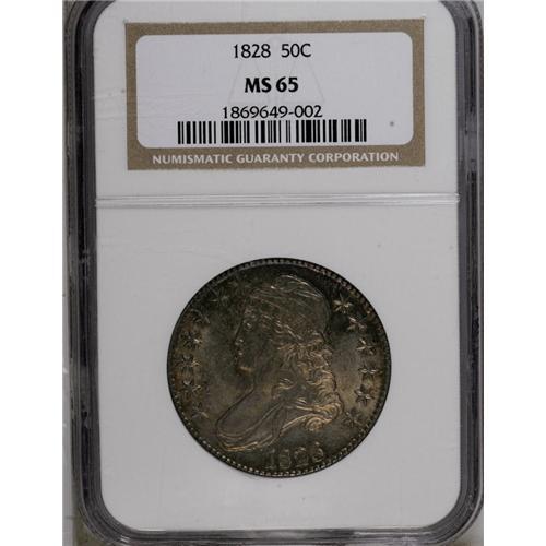 <B>1828 50C Square Base 2, Small 8, Large Letters MS65 NGC.</B></I> O-114, R.3. Attributable by star 13, which is lightly joined to a curl, and peripheral die cracks on the reverse. Even though a fairly common variety, this piece must surely be one of the finest known at the MS65 level. This is a sharply defined example that has bright mint luster with an overlay of golden-rose toning that deepens and includes royal blue around scattered parts of the peripheries. An outstanding, high grade Bust half.<BR><BR><b>Shipping:</b> Coins & Currency (<a target="_blank" href="http://www.heritageauctions.com/common/shipping.php">view shipping information</a>)