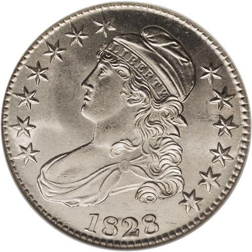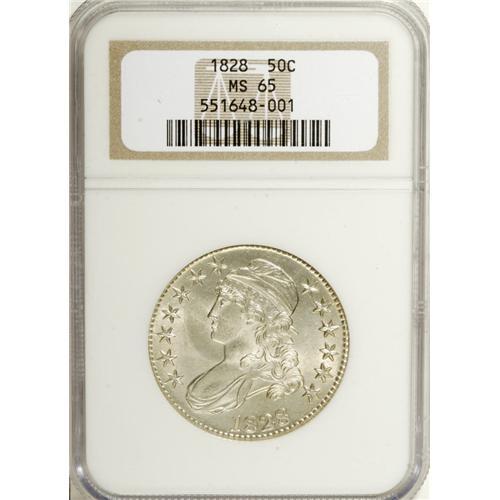 <B>1828 50C Square Base 2, Small 8, Large Letters MS65 NGC.</B></I> O-115, R.2. Both sides of this coin exhibit an exactness of strike that is often absent on half dollars of this type. Not only are the denticles crisp and even from an expertly centered impression, but the peripheral and central devices are equally sharp with essentially full definition. The untoned surfaces allow rich mint luster to shine forth at all angles. There is not a single noteworthy abrasion, but accuracy compels us to mention a faint grease stain (as struck) on the obverse at star 10 and another, equally hard to discern near 7 o'clock on the reverse border. A probable Condition Census representative of this otherwise easily obtainable die marriage.<BR><BR><b>Shipping:</b> Coins & Currency (<a target="_blank" href="http://www.heritageauctions.com/common/shipping.php">view shipping information</a>)