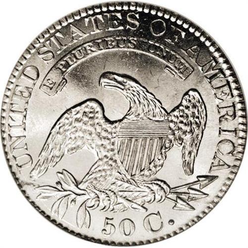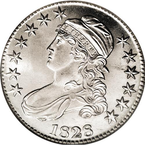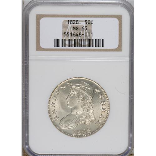 <B>1828 50C Square Base 2, Small 8, Large Letters MS65 NGC.</B></I> O-115, R.2. Both sides of this coin exhibit an exactness of strike that is often absent on half dollars of this type. Not only are the denticles crisp and even from an expertly centered impression, but the peripheral and central devices are equally sharp with essentially full definition. The untoned surfaces allow rich mint luster to shine forth at all angles. There is not a single noteworthy abrasion, but accuracy compels us to mention a faint grease stain (as struck) on the obverse at star 10 and another, equally hard to discern near 7 o'clock on the reverse border. A probable Condition Census representative of this otherwise easily obtainable die marriage.<BR><BR><b>Shipping:</b> Coins & Currency (<a target="_blank" href="http://www.heritageauctions.com/common/shipping.php">view shipping information</a>)