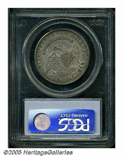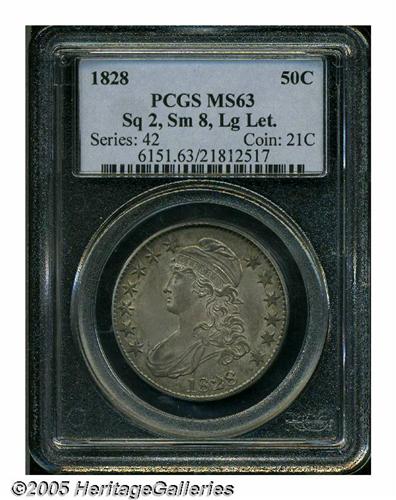 <B>1828<50C> Square Base 2, Small 8, Large Letters MS63 PCGS.</B></I> O-122, R.3. A blanket of rich dove-gray patina embraces this boldly struck and satiny representative. In Mint State, a scarce <I>Guide Book</B></I> variety. Population: 14 in 63, 13 finer (4/05).