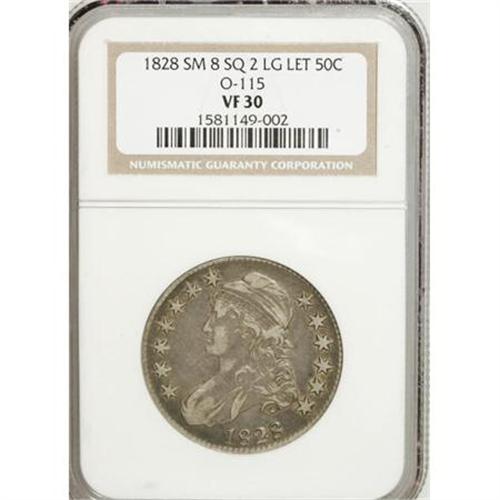 <B>1828 50C Square Base 2, Small 8, Large Letters VF30 NGC.</B></I> O-115. NGC Census: (0/0). PCGS Population (7/205). (#6151)<BR><BR><B>Coin Engraver:</B> John Reich<BR><BR><b>Shipping:</b> Coins & Currency (<a target="_blank" href="http://www.heritageauctions.com/common/shipping.php">view shipping information</a>)