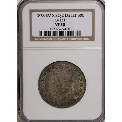 <B>1828 50C Square Base 2, Small 8, Large Letters VF30 NGC.</B></I> O-121. NGC Census: (0/0). PCGS Population (9/217). (#6151)<BR><BR><B>Coin Engraver:</B> John Reich<BR><BR><b>Shipping:</b> Coins & Currency (<a target="_blank" href="http://www.heritageauctions.com/common/shipping.php">view shipping information</a>)