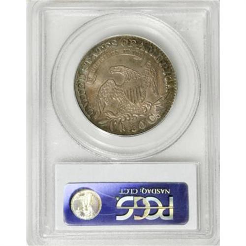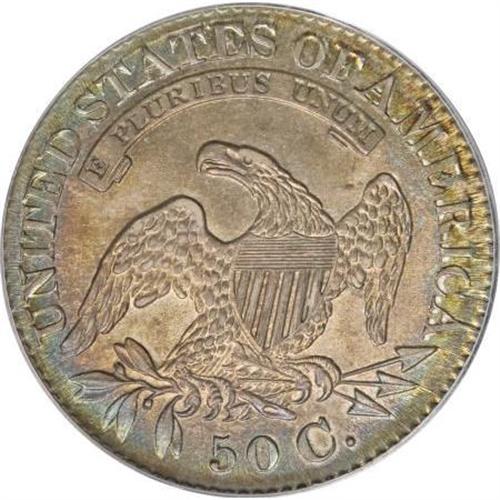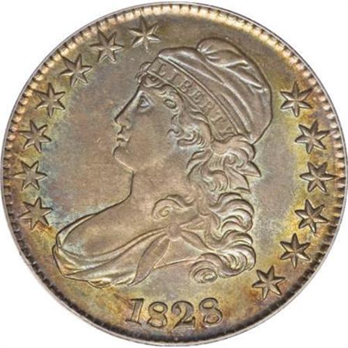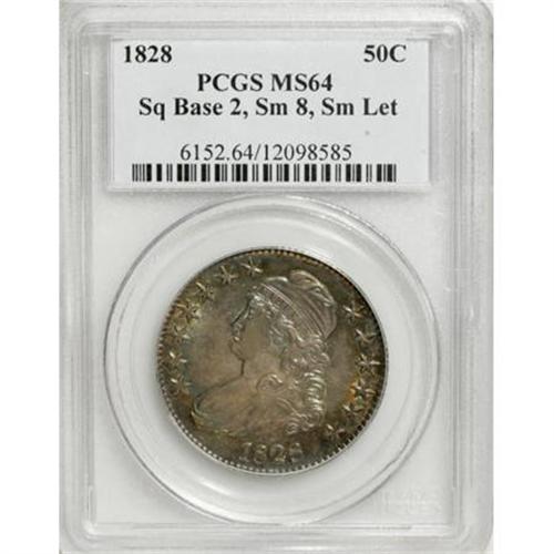 <B>1828 50C Square Base 2, Small 8, Large Letters MS64 PCGS.</B></I> O-117a, R.1. Incorrectly identified as a Small Letters variety by PCGS. Ocean-blue and orange-gold alternate across this deeply toned and lightly abraded example. A trophy for the connoisseur of patinated coins. The serif of the C in the denomination is broadly recut, and this diagnostic provides ready identification of the Overton marriage.<BR><BR><B>Coin Engraver:</B> John Reich<BR><BR><b>Shipping:</b> Coins & Currency (<a target="_blank" href="http://www.heritageauctions.com/common/shipping.php">view shipping information</a>)