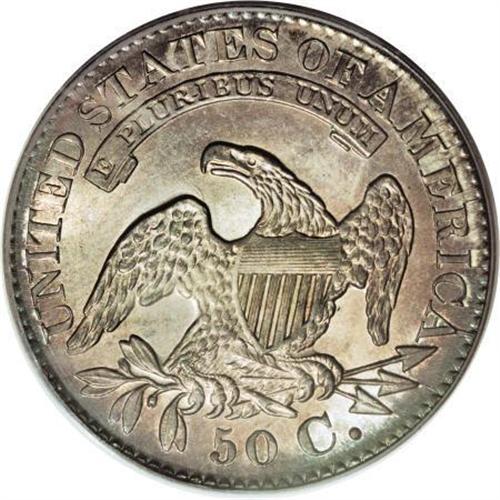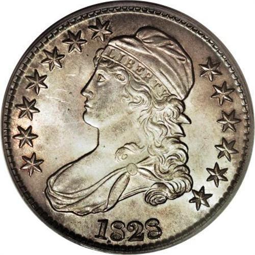 <B>1828 50C Square Base 2, Small 8, Large Letters MS63 PCGS.</B></I> O-113, R.3. This satiny Select half features dusky peach and jade-green toning. The obverse field and Liberty's jaw have a few faded marks, but the overall appearance is impressively clean. The strike is precise save for some blending on the shield lines.<BR><BR><B>Coin Engraver:</B> John Reich<BR><BR><b>Shipping:</b> Coins & Currency (<a target="_blank" href="http://www.heritageauctions.com/common/shipping.php">view shipping information</a>)