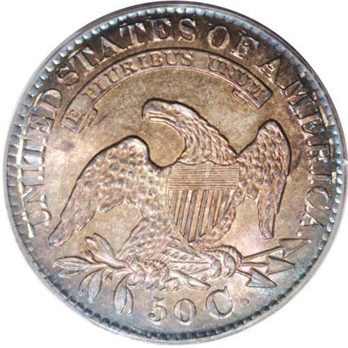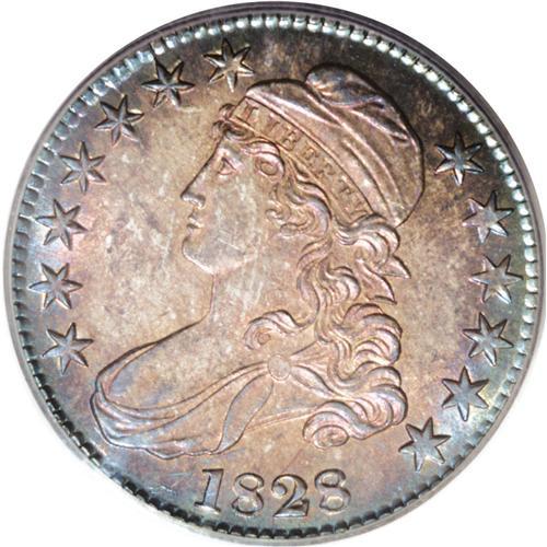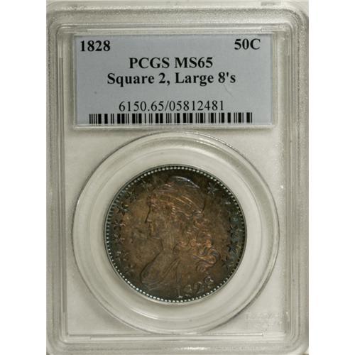 <B>1828 50C Square Base 2, Small 8, Large Letters MS65 PCGS.</B></I> O-122, R.3. This is an amazing Gem example that is probably the finest known of the die marriage. It is the only MS65 example recorded by Stephen Herrman among recently auctioned examples. The next best to appear in recent auctions sales is a coin that grades just MS63. Both sides have fully lustrous and frosty surfaces that are highly visible beneath translucent rose, lilac, and blue color. Incorrectly designated as a Large 8 variety by PCGS. Population: 5 in 65, 0 finer (1/07).<BR><I>Ex: Lester Merkin (2/1972), lot 181; The New York Connoisseur's Collection (American Numismatic Rarities, 3/2006), lot 750.</B></I><BR><I>From The Rocky Top Collection of Bust Half Dollars.</B></I><BR><BR><b>Shipping:</b> Coins & Currency (<a target="_blank" href="http://www.heritageauctions.com/common/shipping.php">view shipping information</a>)