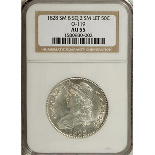 <B>1828 50C Small 8, Square Base 2, Small Letters AU55 NGC.</B></I> O-119. Population: 4 in 55, 14 finer (7/07).Census: 0 in 55, 0 finer (7/07).<BR><BR><B>Coin Engraver:</B> John Reich<BR><BR><b>Shipping:</b> Coins & Currency (<a target="_blank" href="http://www.heritageauctions.com/common/shipping.php">view shipping information</a>)