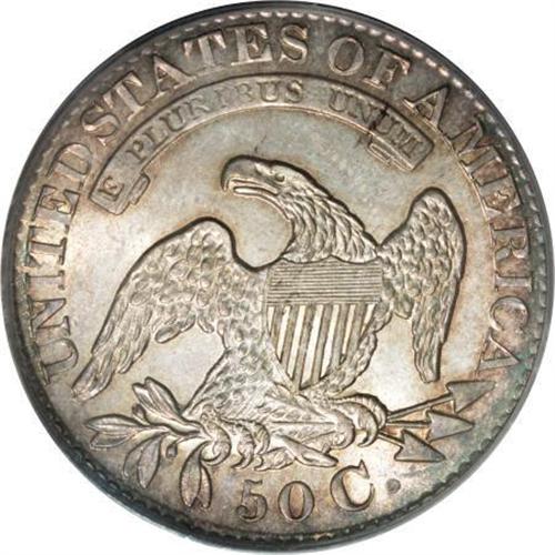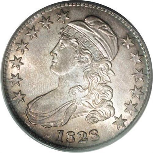<B>1828 50C Square Base 2, Small 8, Large Letters MS64 PCGS.</B></I> O-122, R.3. Incorrectly certified by PCGS as a Small Letters variety, which would be O-119. This satiny Choice half is attractively patinated in medium plum-mauve, chestnut-gold, and blue-green shades. Well struck save for the star centers, and impressively free from marks.<BR><BR><B>Coin Engraver:</B> John Reich<BR><BR><b>Shipping:</b> Coins & Currency (<a target="_blank" href="http://www.heritageauctions.com/common/shipping.php">view shipping information</a>)