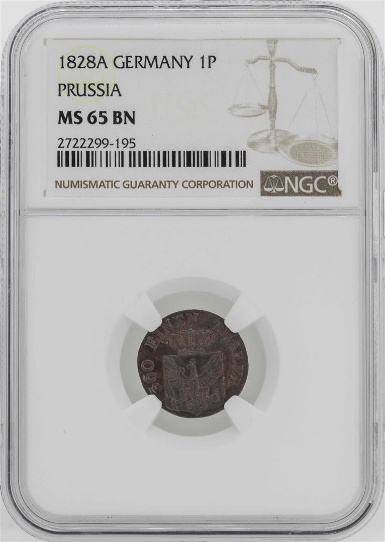 One 1828-A Germany-Prussia Friedrich Wilhelm II Pfenning NGC MS65BN. NGC Certified.