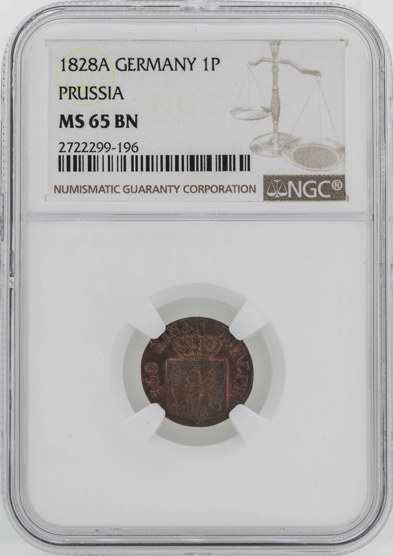 One 1828-A Germany-Prussia Friedrich Wilhelm II Pfenning NGC MS65BN.