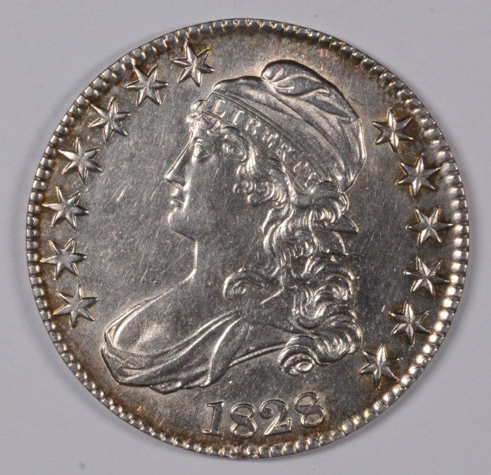 1828 BUST HALF DOLLAR, AU-58 BEAUTIFUL! SQUARE BASE 2