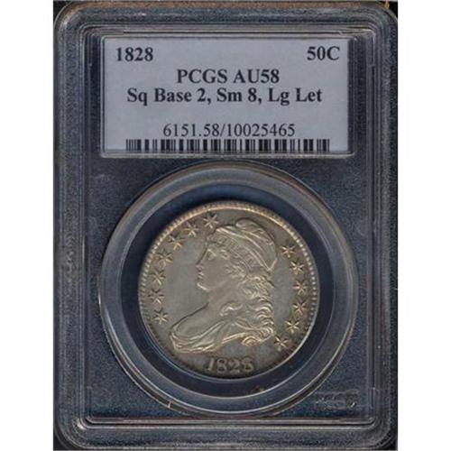 1828 Bust 50C. Sq Base 2, Sm 8's, Lg Letters PCGS AU58