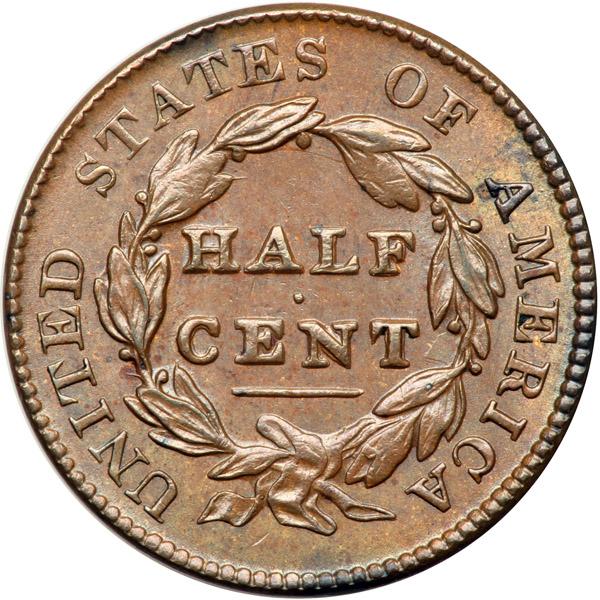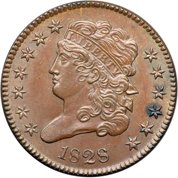 1828 C-1 R1 AU58+. Lustrous medium chocolate and steel brown. A choice mint state piece except for a dark olive brown spot of extremely fine carbon that covers most of star 11. Sharply struck MDS, Manley state 2.0. The spike from the leaf tip over H in HALF is long and sharp, and the fine die clashmarks inside the wreath are clear. Davy #28.1.2.
