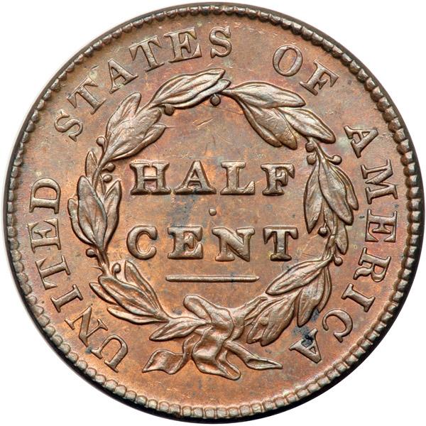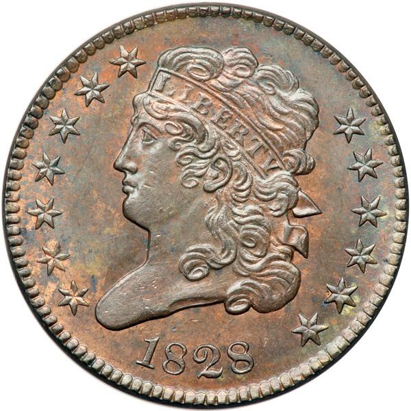1828 C-1 R1 MS62. Lustrous light bluish steel with 20% of the slightly faded mint red remaining. There are microscopic specks of carbon under the A in HALF and some more in the lower half of the second A in AMERICA, plus a microscopic hairline in the field under the chin. Otherwise this piece is choice. Excellent luster and eye appeal for the grade. MDS, Manley state 2.0. The spike from the leaf tip above H in HALF is long and fine die clashmarks show inside the wreath. Davy #28.1.5.