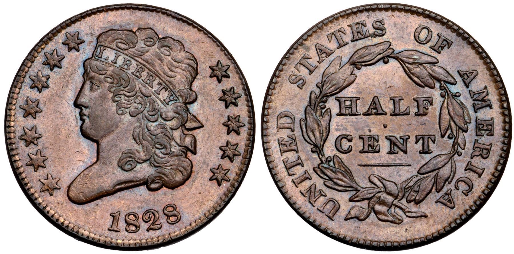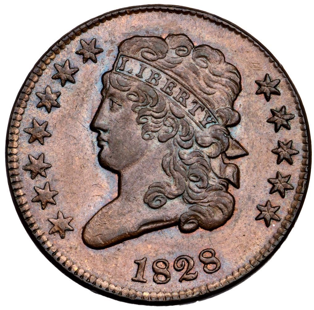 1828 C-2 R-1 MS60+Lustrous light chocolate and medium brown with bluish steel toning in some of the protected areas. Traces of faded mint red can be found in some of the protected areas on the obverse. No spots or stains and the best identifying mark is a tiny, very dull nick on star 1, only visible with a strong glass. Excellent eye appeal. MDS, Manley state 2.0, with faint die clashmarks inside the wreath. Broken out of a PCGS MS63BN CAC holder with the Widok provenance noted (35264.63/26013102 label included).Certificate Number: Pedigree: Ex Stack's 3/11/1982:599 - Carvin Goodridge Collection - Goodridge Estate, McCawley & Grellman Auctions 9/2/2012:309 - Rod Widok Goldbergs 2/16/2020:505 - Bob Kebler Collection