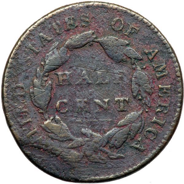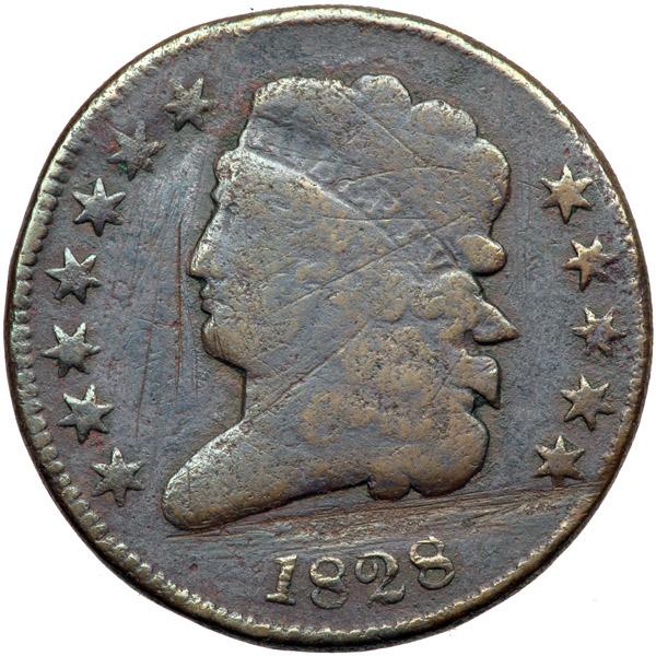 1828 C-2 R1 12-Star Obverse G4. Double Struck Off Center, Off Center Reverse Brockage Maker. A few points sharper but the surfaces are a bit rough, especially the reverse where you can find some shallow reddish scale or verdigris, and there are some relatively deep scratches above the date and in the field before the portrait. The scratches are old and blend into the toning, but they are obvious to the naked eye. Not an especially attractive half cent, but the error is significant. Double struck. The first strike was normal and centered on the planchet but the coin failed to eject completely as a new blank planchet was inserted into the coining chamber. The second strike was 85% off center. The obverse was struck against the new blank planchet at stars 5-7 while the reverse was struck by the reverse die at the opposing place leaving much of TES from STATES over UN in UNITED. An ugly half cent but a wonderful mint error. Davy #28.2.13.
