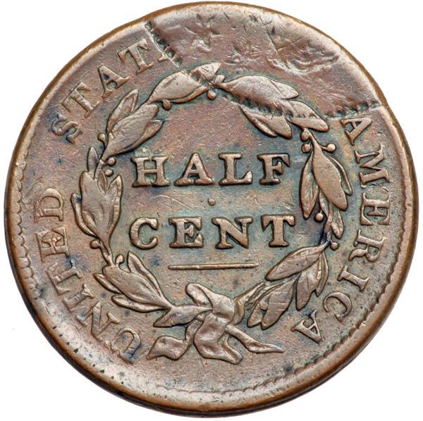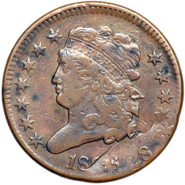 1828 C-3 R1 F12. Double Struck over Off Center Obverse Brockage. Glossy steel brown and light chocolate with spots of darker olive toning scattered over the both sides. Possibly retoned. Smooth surfaces with only trivial contact marks. The obverse was struck two times, the first strike slightly off center to the bottom and rotated about 20 degrees relative to the properly centered second strike. The result is two complete dates reading "18218828". The doubling shows only at the bottom of the obverse, which is directly opposite an off center brockage impression of the obverse covering ES-OF. The brockage shows incuse impressions of two stars and the top of the head inside an arc of incuse dentils. This suggests there were two strikes: one normal and centered and the other slightly off center with an off center struck half cent coming between the reverse and the die. Plated on page 482 in the Breen encyclopedia to illustrate what he calls "Double struck on partial obverse brockage." Davy #28.3.7.