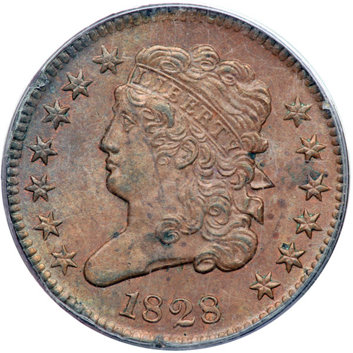 1828 C-3 R1 PCGS graded MS63 Brown. 13-Star Obverse. Frosty steel brown with a hint of bluish steel overtone in the fields and peeps of faded mint red remaining on the obverse. The only marks are a few wisps of darker toning on both sides, the largest of these between stars 9 & 10. E-MDS, Manley state 2.0. Our grade is MS60. Housed in an old green-label PCGS holder.