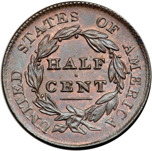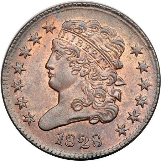 1828 C-3 R1. PCGS graded MS-63 Red & Brown. Very attractive and highly lustrous bluish steel brown and light chocolate with 15% of the mint red remaining. The surfaces are satiny and nearly flawless. The only mark is a tiny speck of fine carbon under the left end of the E in AMERICA. MDS, Manley state 3.0. The fine die clashmark at the throat is clear. Our grade is consistent with the slab grade. The attribution and Carvin Goodridge provenance are noted on the PCGS label. PCGS population 3; tied for finest graded in RB (#35262).
