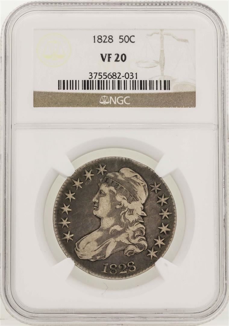 One 1828 Capped Bust Half Dollar Coin NGC VF20. NGC Certified.