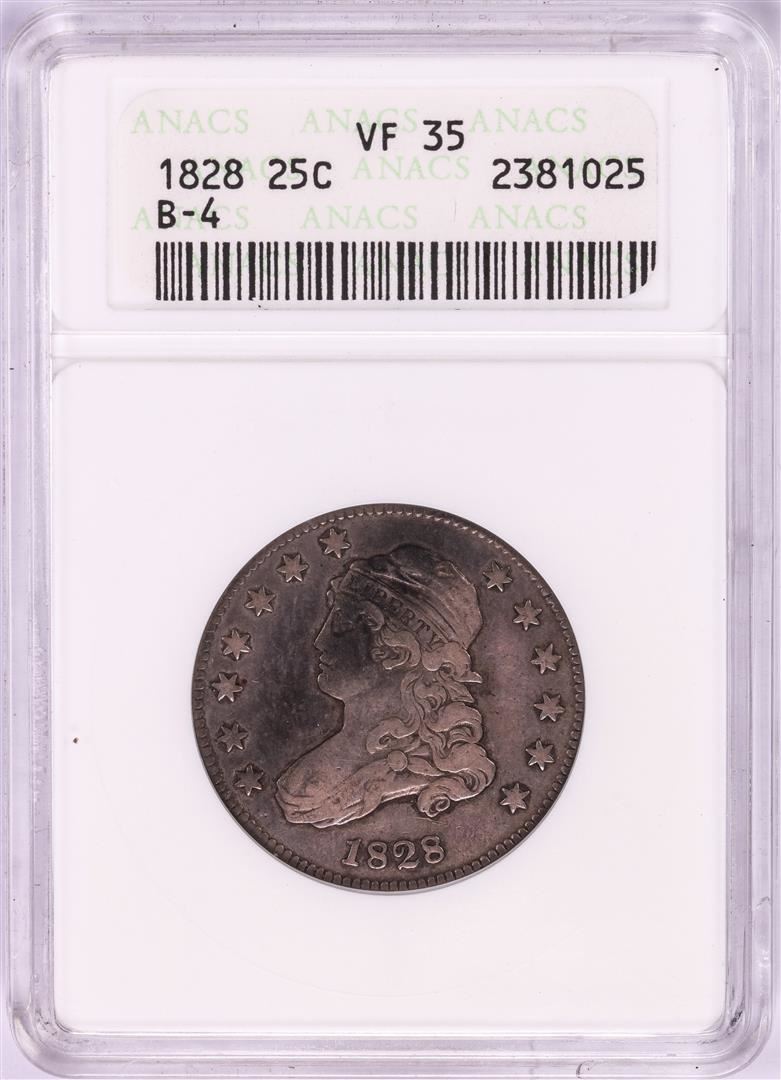 One 1828 Capped Bust Quarter Coin ANACS VF35 B-4. ANACS Certified.