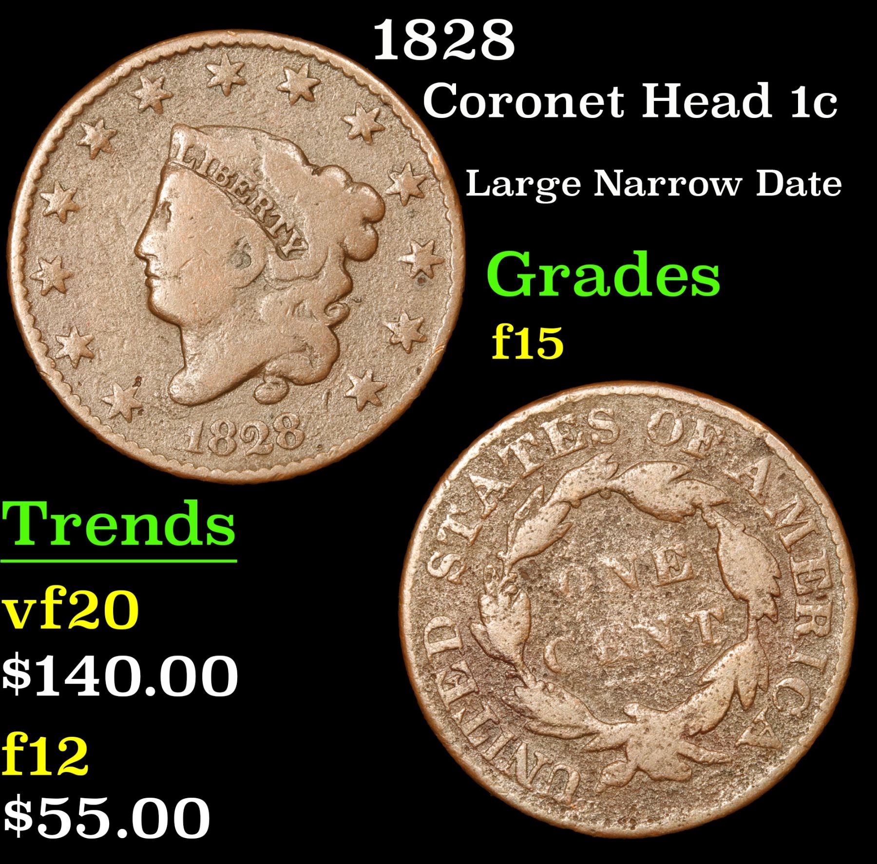 1828 Coronet Head Large Cent 1c Grades f+. Large Narrow Date
