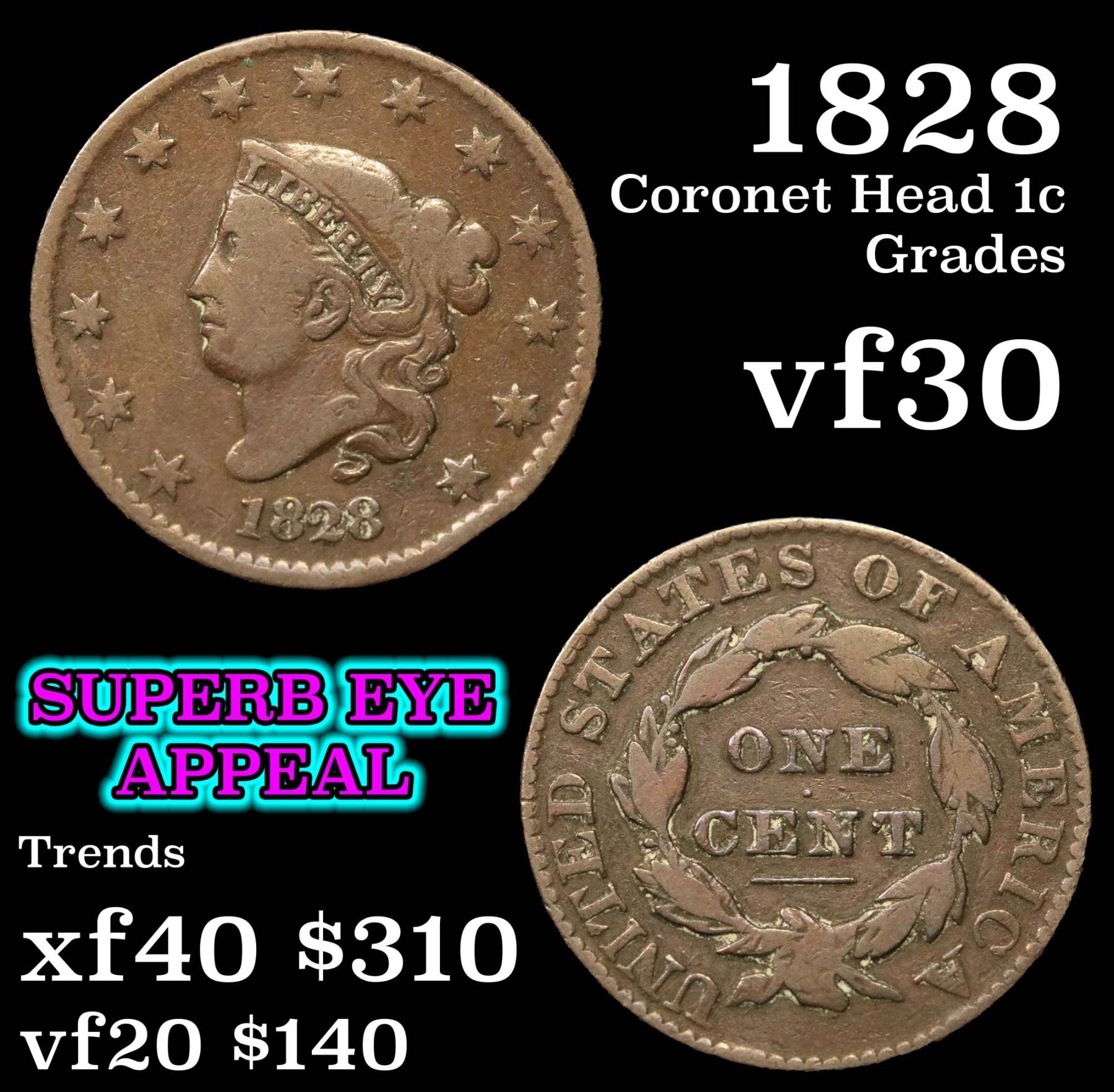 1828 Coronet Head Large Cent 1c Grades vf++.