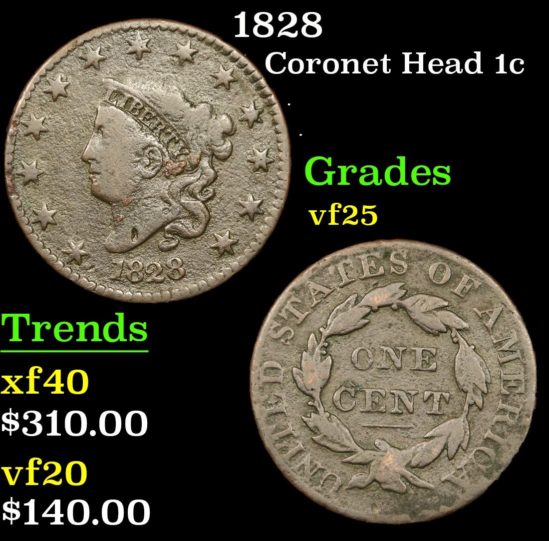 1828 Coronet Head Large Cent 1c Grades vf+.