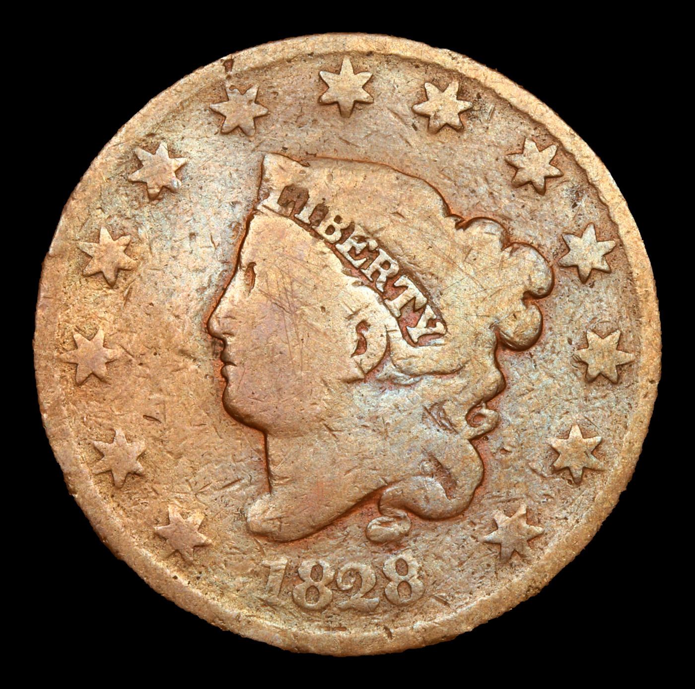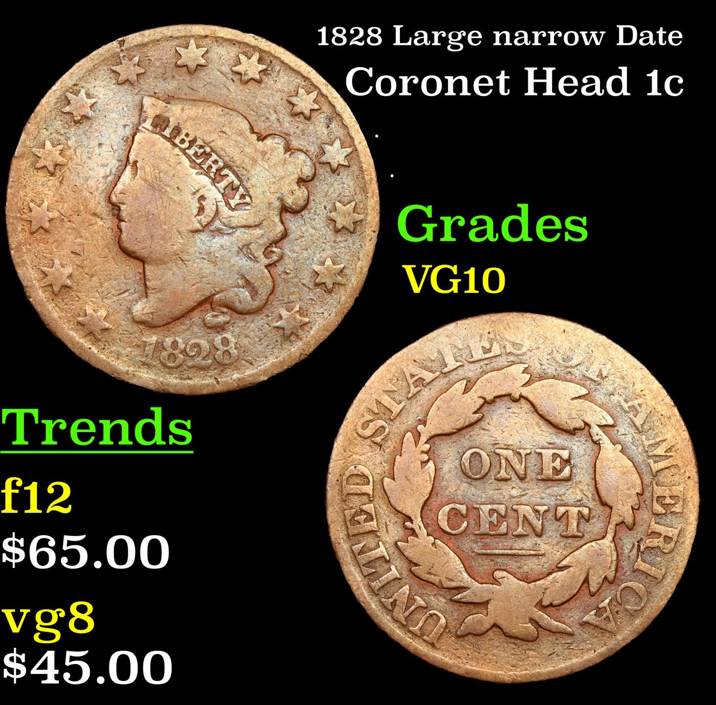 1828 Large narrow Date Coronet Head Large Cent 1c Grades vg+.