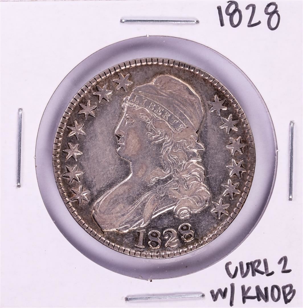 One 1828 Curl 2 with Knob Capped Bust Half Dollar Coin.
