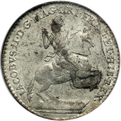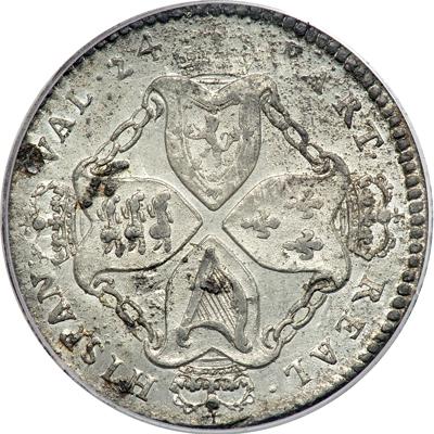 (1828) Holt's American Plantation 1/24 Real Restrike of 1828 Breen-78. PCGS graded MS-62. Lustrous bright silvery gray with darker steel gray toning on the highest points of the design. This piece is choice except for a few spots of "tin pest" on both sides. The largest spot is nestled between the front legs of the horse and a smaller one covers the back of the neck of the rider. These pieces, struck on nearly pure tin planchets, originally were intended for the American plantations (the operative term for American "colonies" at that time), but they were not well received due in part to their rapid deterioration in the humid atmosphere of New York and New England. Tin is a highly reactive metal, and it is understandably difficult to find examples that have survived without any spots of tin pest. Many are heavily corroded. About 1828 a coin dealer in London, Matthew Young, obtained a couple pairs of the original dies and struck about two hundred pieces for collectors. The example offered here is from that group of restrikes. Pop 6; 5 finer in 63.