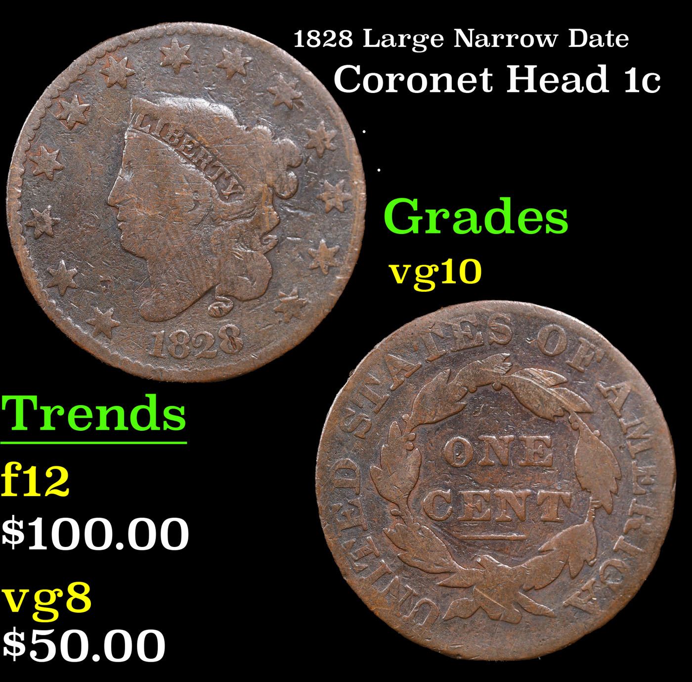 1828 Large Narrow Date Coronet Head Large Cent 1c Grades vg+.